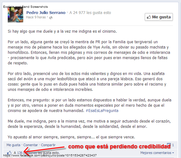 Mucha gente le señaló a Pedro Julio el embuste que publicó. Al ver que su cuento no fue creído decidió hacer lo que hace cuando se ve en aprietos, borrar. Pedro Julio el cobarde vuelve a borrar la historia. Si trató de buscar la historia en el enlace de arriba de seguro no la encontró ¿verdad? Es porque Pedro Julio tiene la costumbre de que cuando lo cogen en pifia borra lo que hace como el nene chiquito que esconde las manos pa que no vean que estaba jugando con fango cuando lo cogen. El enlace que había era este: htttps://www.facebook.com/pedrojulio/posts/10151533555313437